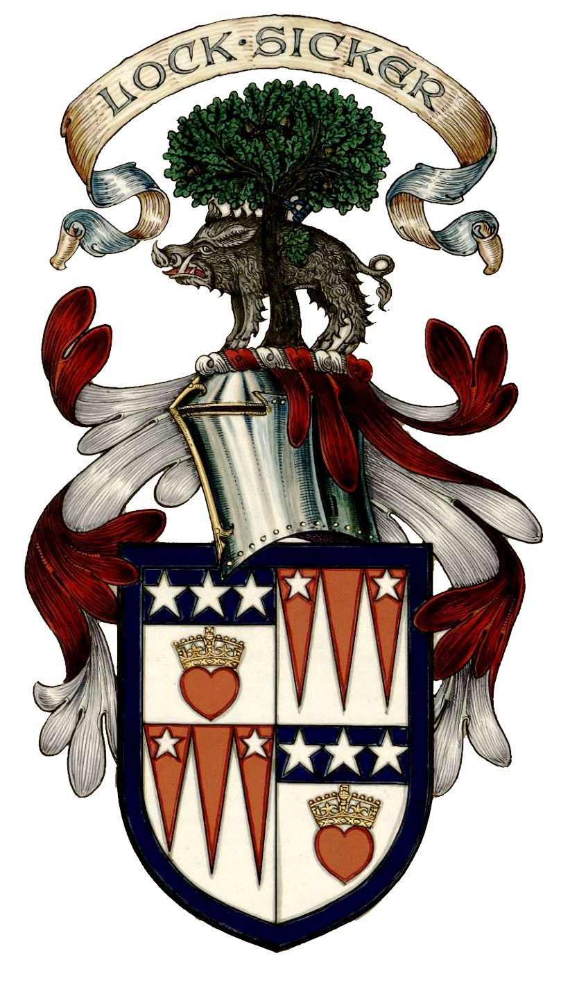 The arms of Sholto Osborne Gordon Douglas. Quarterly, 1 and 4 Argent a man's heart Gules ensigned with an imperial crown Or, on a chief Azure three mullets of the field (for Douglas); 2 and 3 Argent three piles issuing from the chief Gules and in chief two mullets of the field (for Douglas of Lochleven), all within a bordure Azure. |