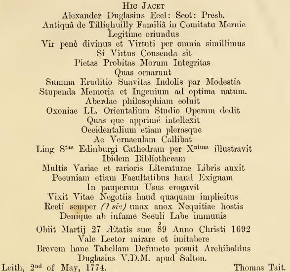 of Salton, and transcribed from a copy signed and dated 1773, has not been traced. But it may, perhaps, be reasonably inferred from the fact of a copy having been taken no less than 80 years after the Professor's death, that the inscription had been erected and was then extant.