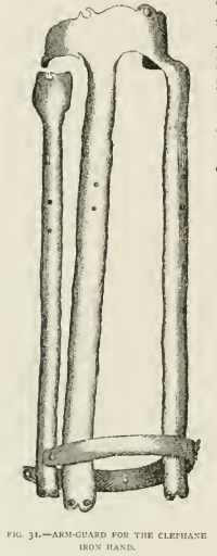 The wrist end of the hand was attached to a light iron framework (see Fig. 31) that extended up the arm as far as the elbow. A similar prosthetic, with a more complex mechanism, is found in the Meyrick Collection and is attributed to the sixteenth century. It is illustrated on Plate LXVII of Skelton’s *Ancient Arms and Armour*.