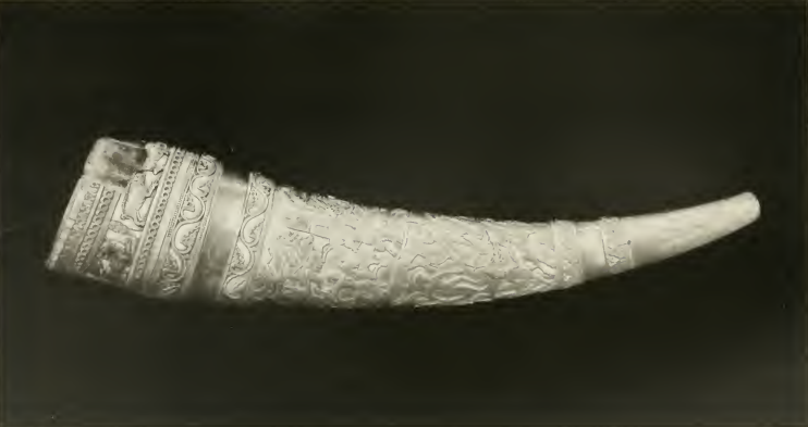 This horn, long held by the Clephane family of Kirkness and Carslogie, Fifeshire, is believed to have been in their possession since time immemorial. Made of ivory, it measures 22½ inches in length, with a circumference of 14 inches at a point 2½ inches from the broad end. The narrow end has a circumference of 3½ inches.
