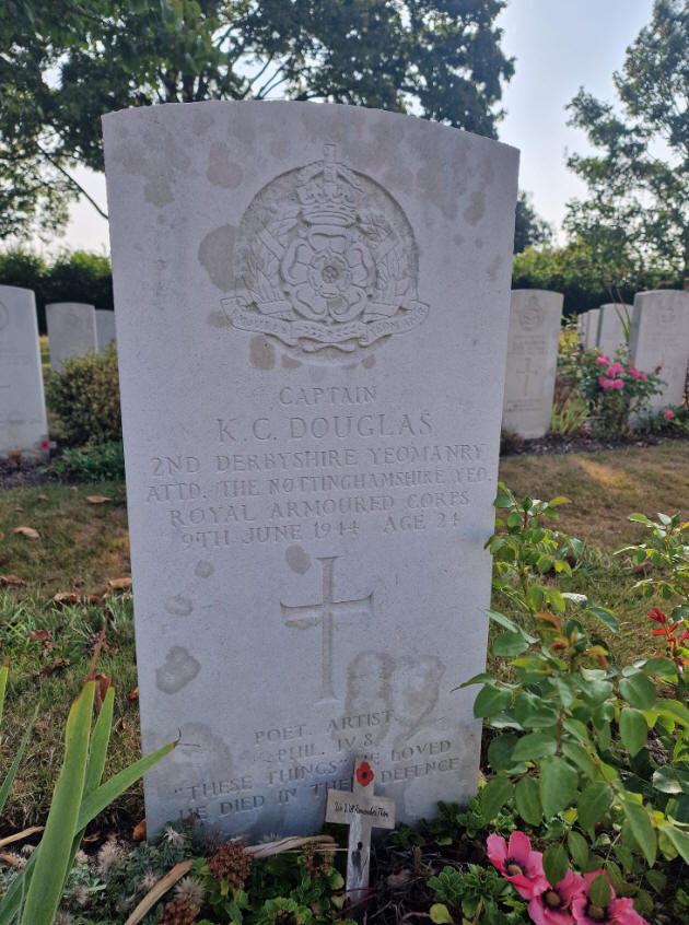 leave home in early 1928 to seek better employment in Wales. The persistent ill-health of Marie led to the collapse of the marriage of his parents by the end of that year, and his father remarried in 1930. Douglas was deeply hurt by his father not communicating with him after 1928, and when Capt. Douglas did write at last in 1938, Keith did not agree to meet him. In one of his letters written in 1940 Douglas looked back on his childhood: "I lived alone during the most fluid and formative years of my life, and during that time I lived on my imagination, which was so powerful as to persuade me that the things I imagined would come true." Marie Douglas faced extreme financial distress, so much so that only the generosity of the Edgeborough headmaster Mr. James permitted Douglas to attend school in 1930-1931, his last year there. Douglas sat in 1931 for the entrance examination to Christ's Hospital, where education was free and there was monetary assistance to cover all other costs. He was accepted, and joined Christ's Hospital, near Horsham, in September 1931, studying there till. It was at this school that his considerable poetic talent and artistic ability were recognised. So was his cavalier attitude to authority and property, which nearly led to expulsion in 1935 over a purloined training rifle. In surprising contrast, he excelled as a member of the school's Officers Training Corps, particularly enjoying drill, although he was philosophically opposed to militarism. His poetry opens the eyes of civilians to the horrors of war. After his bruising brush with authority in 1935, Douglas settled down to a less troubled and more productive period at school, during which he excelled both at studies and games, and at the end of which he won an Open Exhibition to Merton College, Oxford in 1938 to read History and English. The well-known poet Edmund Blunden was his tutor at Merton, and regarded his poetic talent highly. Blunden sent his poems to T. S. Eliot, the doyen of English poetry: Eliot found Douglas impressive. Douglas became the editor of The Cherwell, and one of the poets anthologised in the collection Eight Oxford Poets (1942), although by the time that volume appeared he was already in the army. He does not seem to have been acquainted with somewhat junior but contemporary Oxford poets like Sidney Keyes, Drummond Allison, John Heath-Stubbs, Philip Larkin etc. who would make names for themselves. At Oxford Douglas entered a relationship with a sophisticated Chinese student named Yingcheng. Her own sentiments towards him were less intense, and she refused to marry him. Yingcheng remained the unrequited love of Douglas's life and the source of his best romantic verse, despite his involvements with other women later, most notably Milena. Within days of the declaration of war he reported to an army recruiting centre with the intention of joining a cavalry regiment, but like many others keen to serve he had to wait, and it was not until July 1940 that he started his training. On 1 February 1941 he passed out from Sandhurst, the British Army officer training academy, and was posted to the Second Derbyshire Yeomanry at Ripon. He was shipped to the Middle East in July 1941 and transferred to the Nottinghamshire (Sherwood Rangers) Yeomanry. Posted initially at Cairo and Palestine, he found himself stuck at Headquarters twenty miles behind El Alamein as a camouflage officer as the Second Battle of El Alamein began. At dawn on 24 October 1942, the Regiment advanced, and suffered numerous casualties from enemy anti-tank guns. Chafing at inactivity, Douglas took off against orders on 27 October, drove to the Regimental HQ in a truck, and reported to the C.O.,Colonel E.O.Kellett, lying that he had been instructed to go to the front (luckily this escapade did not land him in serious trouble; in a reprise of 1935, Douglas got off with an apology). Desperately needing officer replacements, the Colonel posted him to A Squadron, and gave him the opportunity to take part as a fighting tanker in the Eighth Army's victorious sweep through North Africa vividly recounted in his beautiful memoir Alamein to Zem Zem, illustrated with his own drawings. Captain Douglas returned from North Africa to England in December 1943 and took part in the D-Day invasion of Normandy on 6 June 1944. He was killed by enemy mortar fire on 9 June while the Regiment was advancing from Bayeux. The chaplain buried him by a hedge near where he died. His remains now lie in the Tilly-sur-Seulles War Cemetery.
