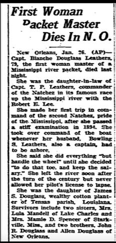 G. William Nott, 1927 interview with Blanche LeathersMississippi River Routes, "Blanche Douglass Leathers : Mississippi Riverboat Captain" by Sue B. Moore