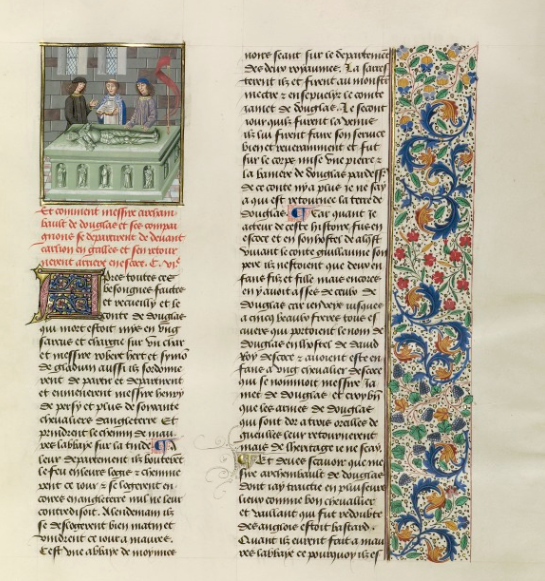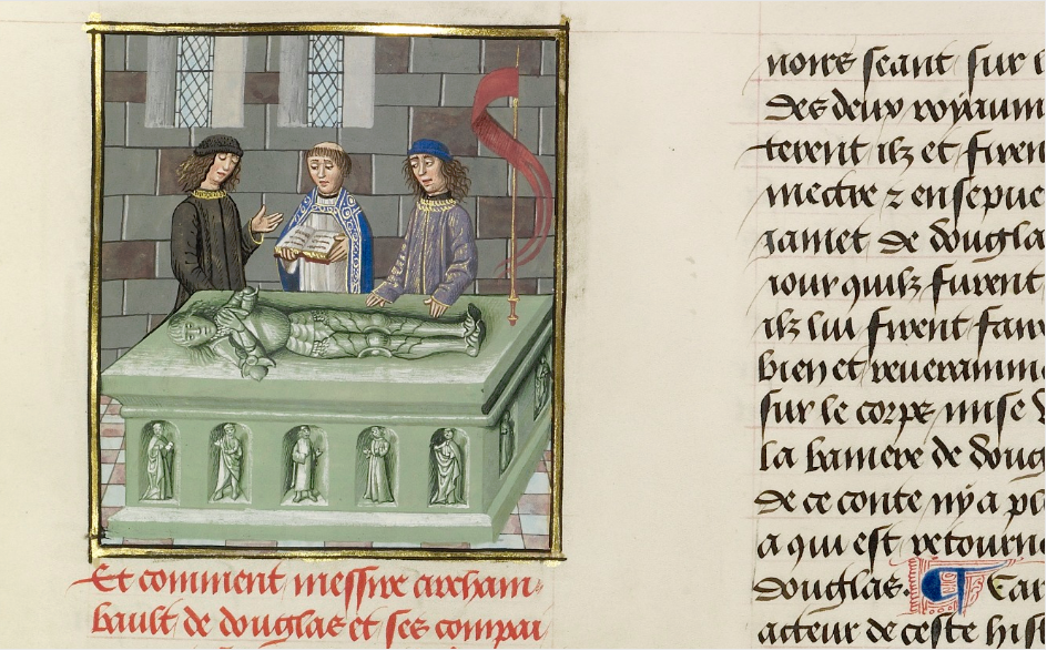 This Flemish manuscript from Chroniques (Book Three) created in Bruges, Belgium in about 1480 - 1483 is titled 'James Douglas Buried in Melrose Abbey'.