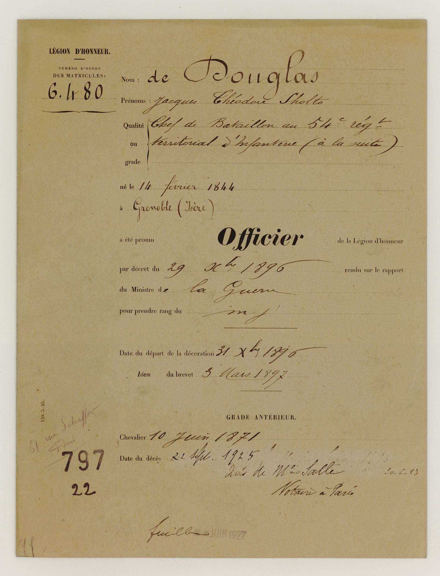 dying on September 22, 1925, in Le Pecq (Yvelines), Jacques Théodore Sholto de Douglas