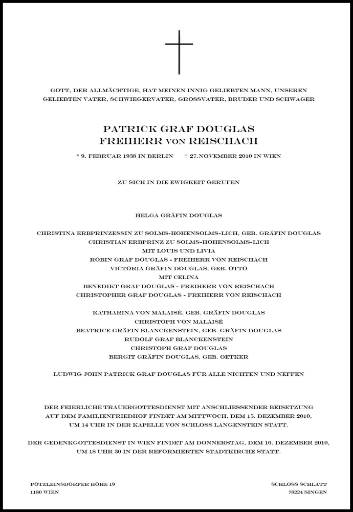Graf Douglas born Berlijn-Tempelhof 9-2-1938, died Wenen