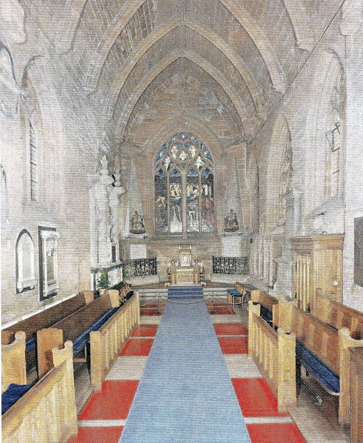 it is a simple oblong chamber with a sacristy on the north side. The
