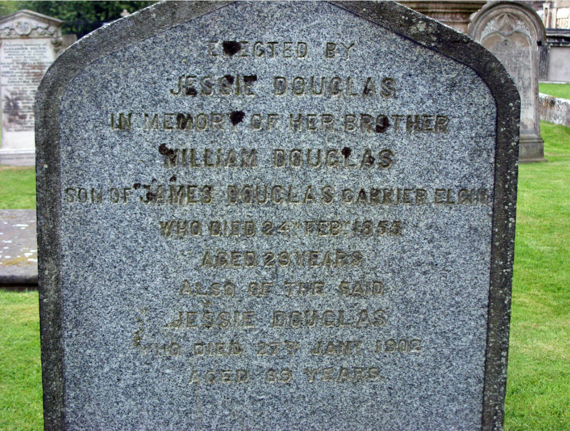 church history. b. ERECTED BY JESSIE DOUGLAS IN MEMORY OF HER BROTHER WILLIAM DOUGLAS SON OF JAMES DOUGLAS CARRIER ELGIN WHO DIED 24TH FEBY 1855 AGED 23 YEARS. ALSO OF THE SAID JESSIE DOUGLAS WHO DIED 27TH JANY 1902 AGED 83 YEARS. c. ERECTED in memory of James Douglas, Carrier Elgin who departed this life on the [4th] of May 1851 aged 72 years.