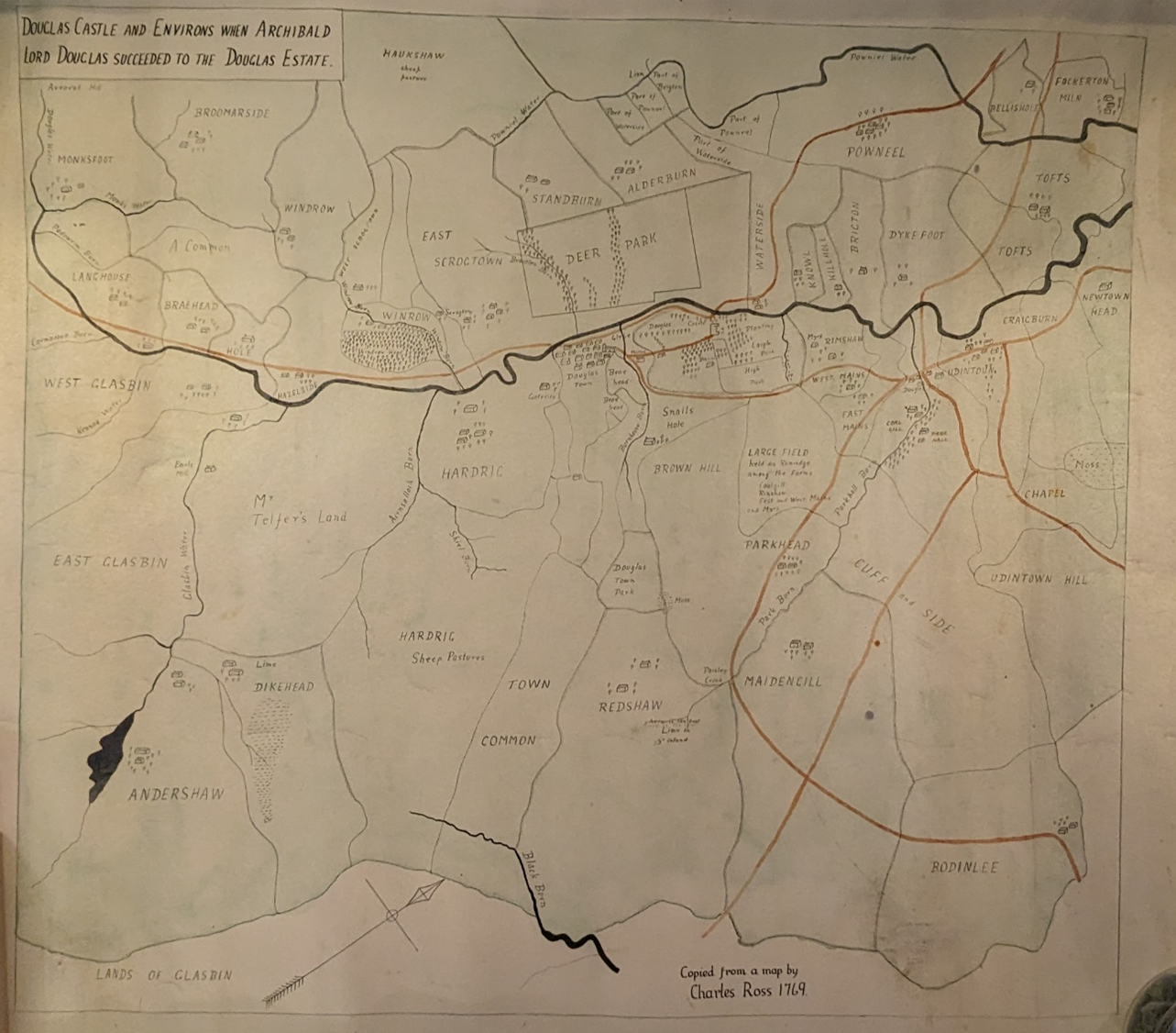 miles south west of Lanark. The name Douglas is of Gaelic origin, dhu-glas meaning black water. The Douglas family took this name when