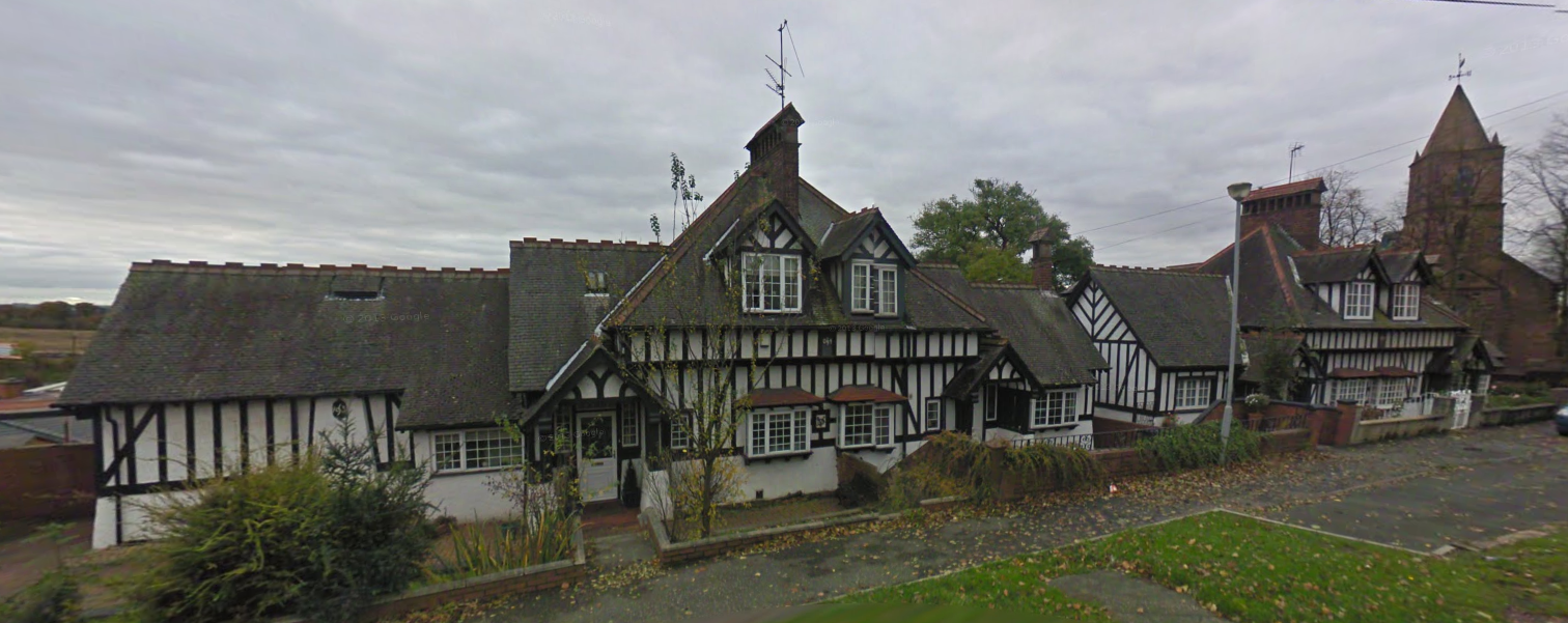 and symmetrical, semi-detached cottages. Half timbered and harled, slate