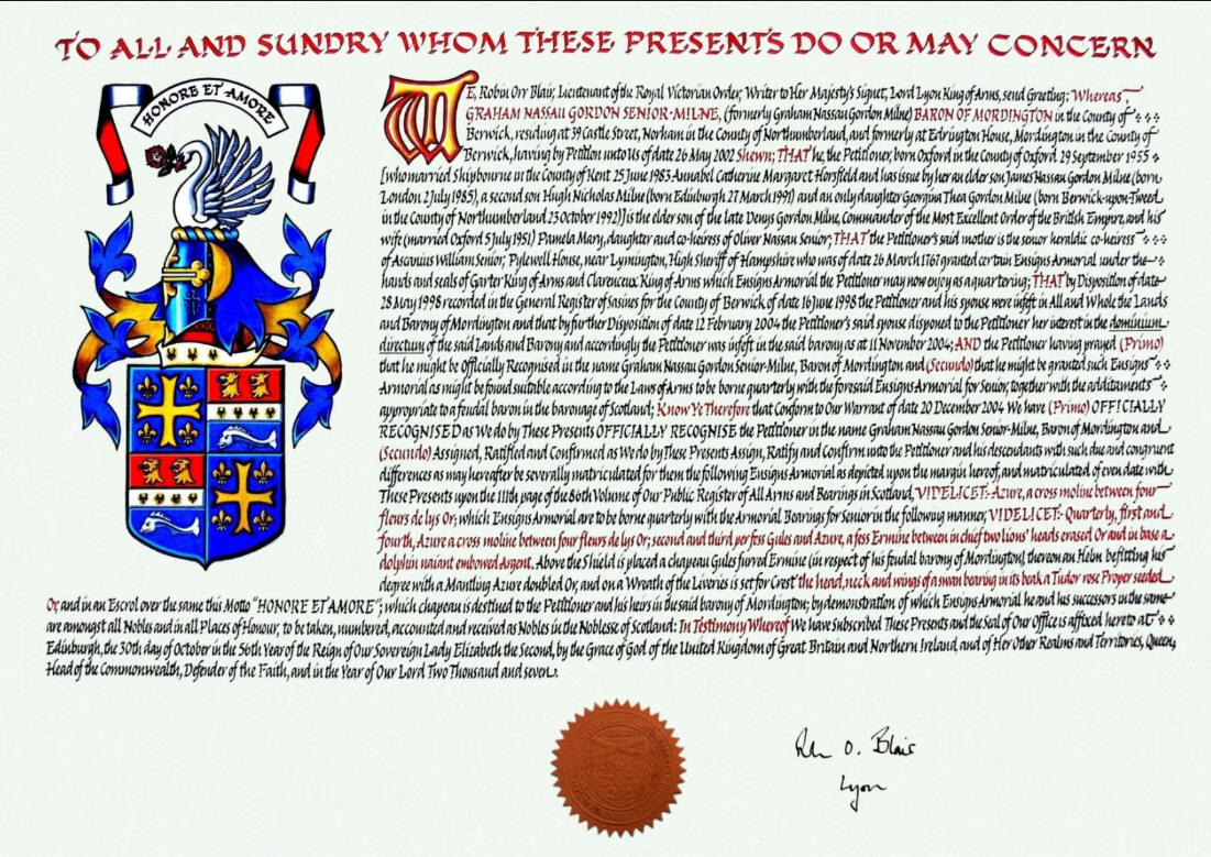 The 41st Baron is Graham Nasau Gordon Senior-Milne, from whose research the