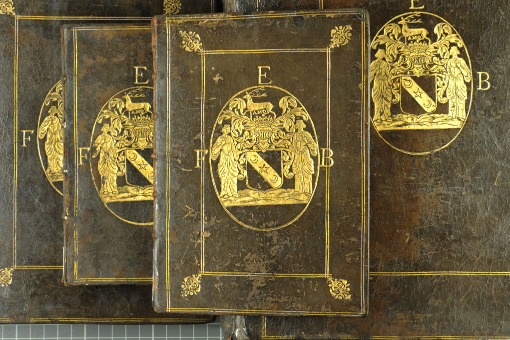 What makes this collection stand out, in regards to bindings, is that all of these items, big and small, were bound uniformly at the time of donation. Each volume has been bound in dark stained calf on boards, with a double gold fillet (usually with gold-stamped floral corners) and the Earl’s coat of arms stamped in gold, with the intials “E.F.B.” on both boards. This stamp does not vary in size, infact the stamp hardly fits on some of the smaller items, and so it is assumed that it was cut for this donation. The coat of arms featured on these bindings is the earliest Buccleuch design, before the Earldom and Duchy expanded. These books are further decorated, when possible (i.e. when the spine was big enough), with the Earl’s coat of arms and initials stamped in gold in each spine panel of each volume. When the surface of the spine was not wide enough, only his initials were stamped. The effect of this decoration style, when walking down the stacks, is that this collection screams “Here I am! Pay attention to me, remember me!” This collection is a beautiful example of fine 17th century presentation bindings and is mostly in very robust condition. Its bindings certainly speak to the magnitude of the Earl’s lasting gift.