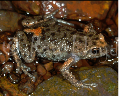 The frog's back is brown with an orange stripe in the middle of the lower back. It has an orange triangle on the snout. The belly is smooth and mottled black and white. Length is typically 30 mm.