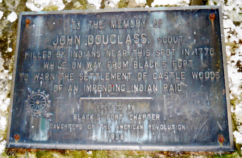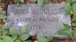 Notes: 1. There is a large flat rock at the site 2. Another versions states: John Douglass, son of Colonel Edward Douglass and Sarah (George) Douglass, was killed by Indians while on a mission to them from Colonel Anthony Bledsoe. 3. The plaque reads as follows – To the Memory of JOHN DOUGLASS, scout killed by the Indians near this spot in 1776 while on the way back from Black’s Fort to warn the settlement of Castle Woods of an impending Indian raid. 4. There is a tenuous family link between Daniel Boone, through Queen Victoria Boone, who married Col. Judge Benjamin Pennebaker Douglas