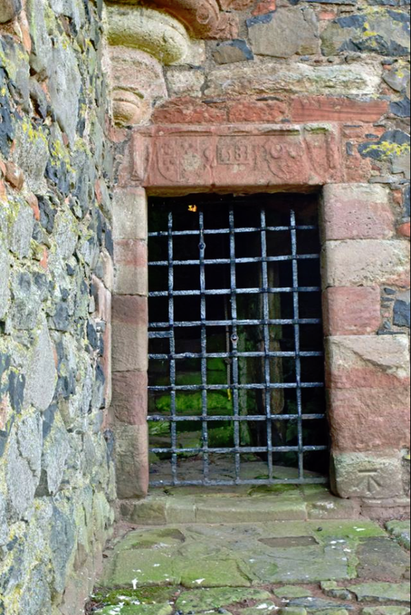 thick wooden door with an iron yett behind it. The yett is an iron grill