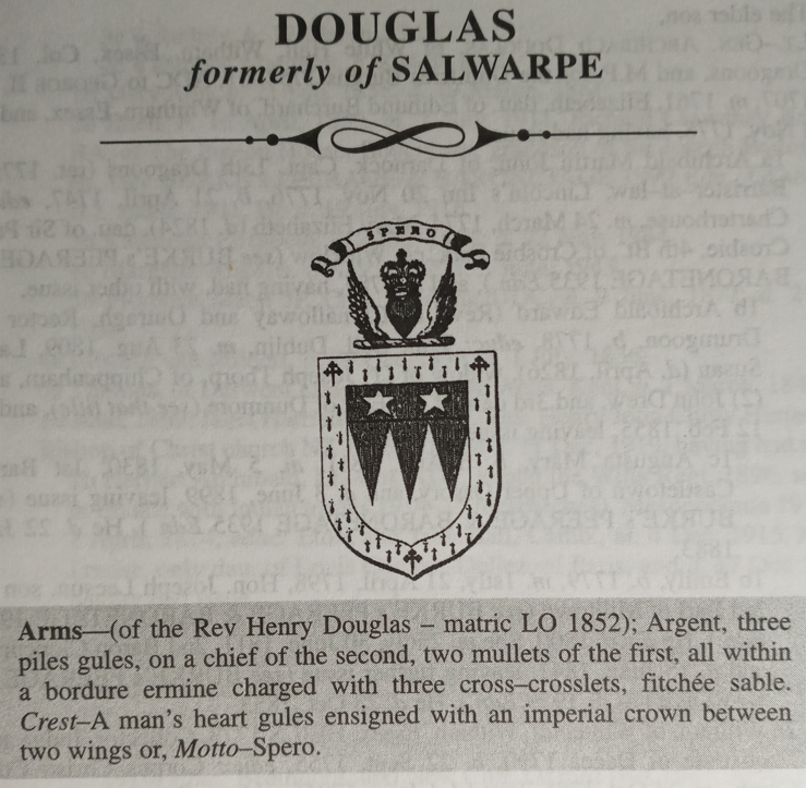 Archibald Douglas of Salwarpe and of High Park, co. Worcester, and of Kingsland, Newcastle-under-Lyme ; born at the Rectory, Salwarpe, on Sunday, 10 April, bapt. at Salwarpe 15 May 1853 (Sponsors : Mrs. How (3rd wife of William Wybergh How of Nearwell, Shrewsbury, Robert Archibald Douglas and Henry Douglas, uncles) ; educated at Marlborough and at Trinity Hall, Cambridge, B.A. 1875, M.A. 1878; admitted a Solicitor November 1879; Lord of the Manor and Patron of the living of Salwarpe.