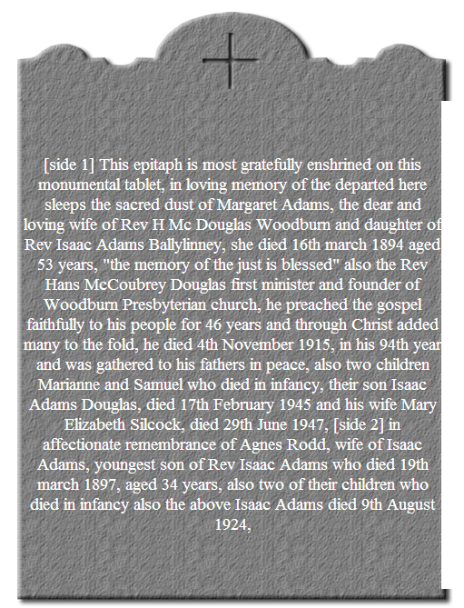 Margaret Douglas's, nee Adams. gravestone : [Granite Pillar And Marble Inset Stone Surrounding][Magaretta Douglas 16th march 1894 Agnes Adams 19th march 1897, not 97 or 98 [203] effects £657 30th April, the will of Margaret [Adams] Douglas late of Woodburn Carrickfergus County Antrim married woman who died 16th March 1894 at same place was proved at Belfast by the Reverend Hans McCourbrey Douglas Presbyterian Clergyman and Margaretta Isabella Douglas Gault of Agnes Street, Belfast Rent agent the executors, [1894 book]