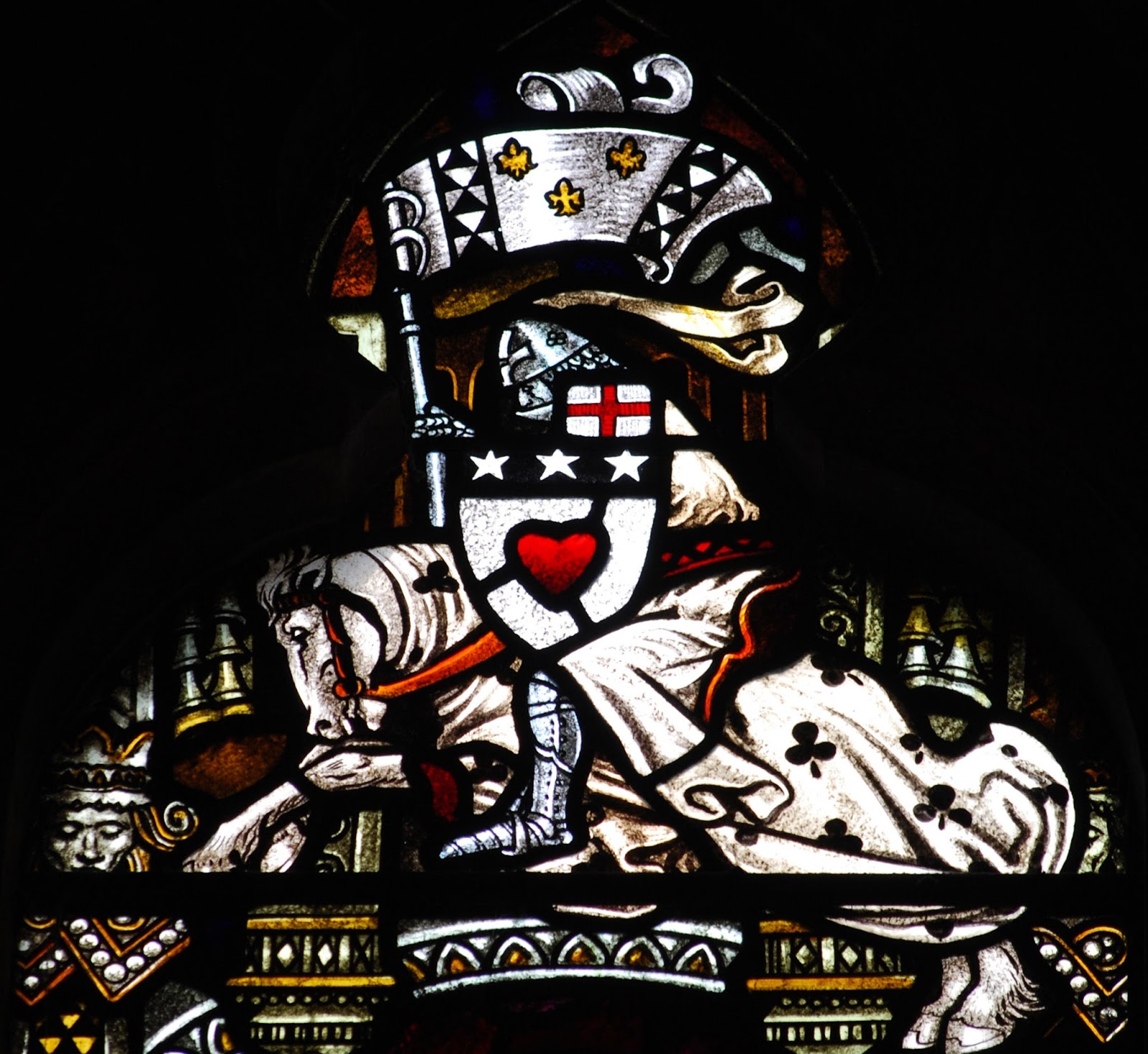 Above her head is a knight on horseback, bearing a banner with fleurs-de-lis and whose pauldron (shoulder armor) marks him as a Crusader (Argent a cross gules). Hee carries a shield with the well-known arms of Douglas: Argent a heart gules on a chief azure three mullets argent.