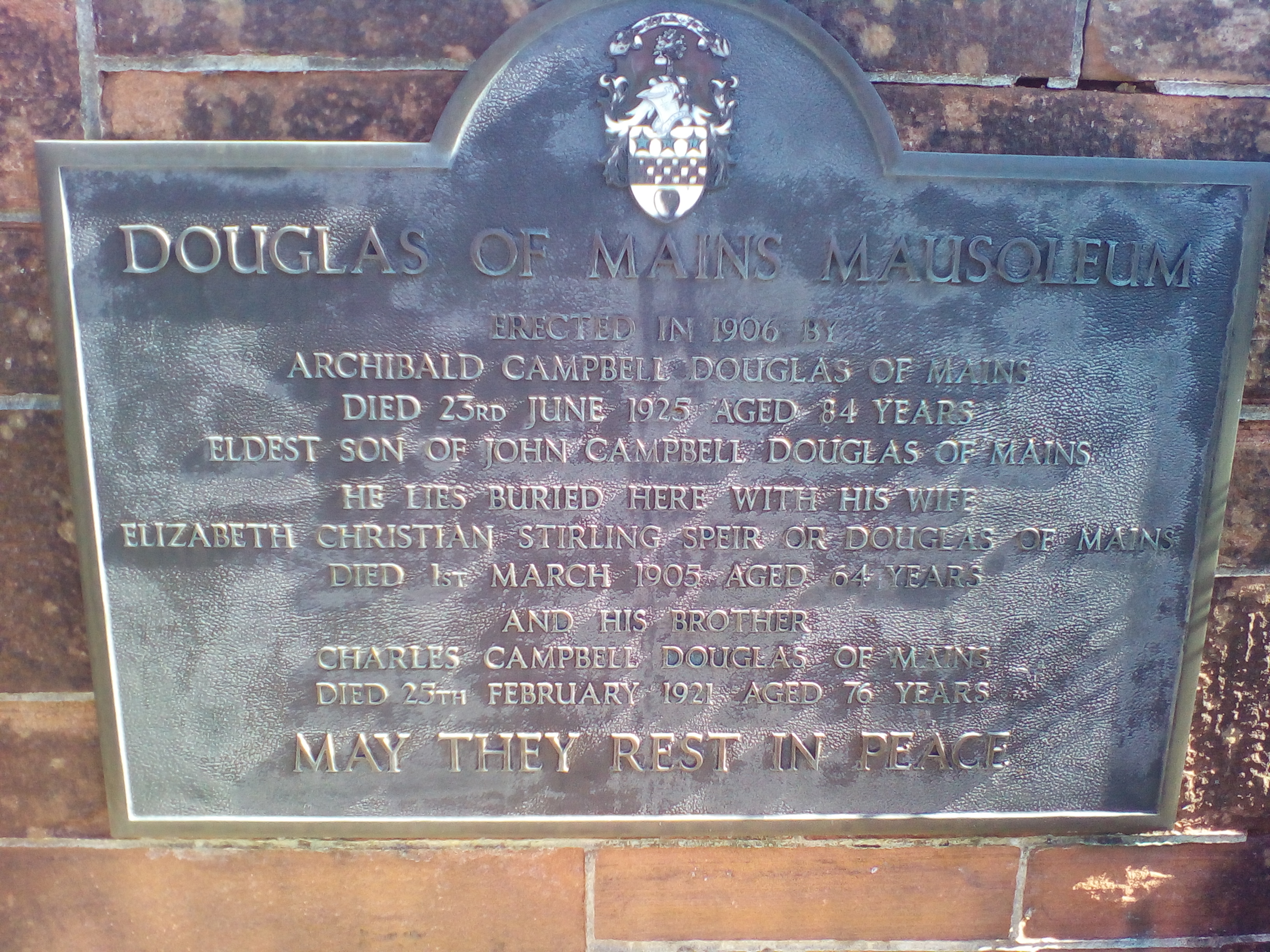 Douglas of Mains crest and raised lettering.