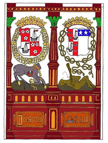 Mary, Queen of Scots to François, the French Dauphin, who later married on 24 April 1558. As the Queen’s closest cousin and first Regent of Scotland (1543–54), Hamilton governed Scotland during her childhood and was her heir presumptive—next in line to the throne until the birth of James VI in 1566. The panel also features the arms of his wife, Margaret Douglas, with their respective family mottos: