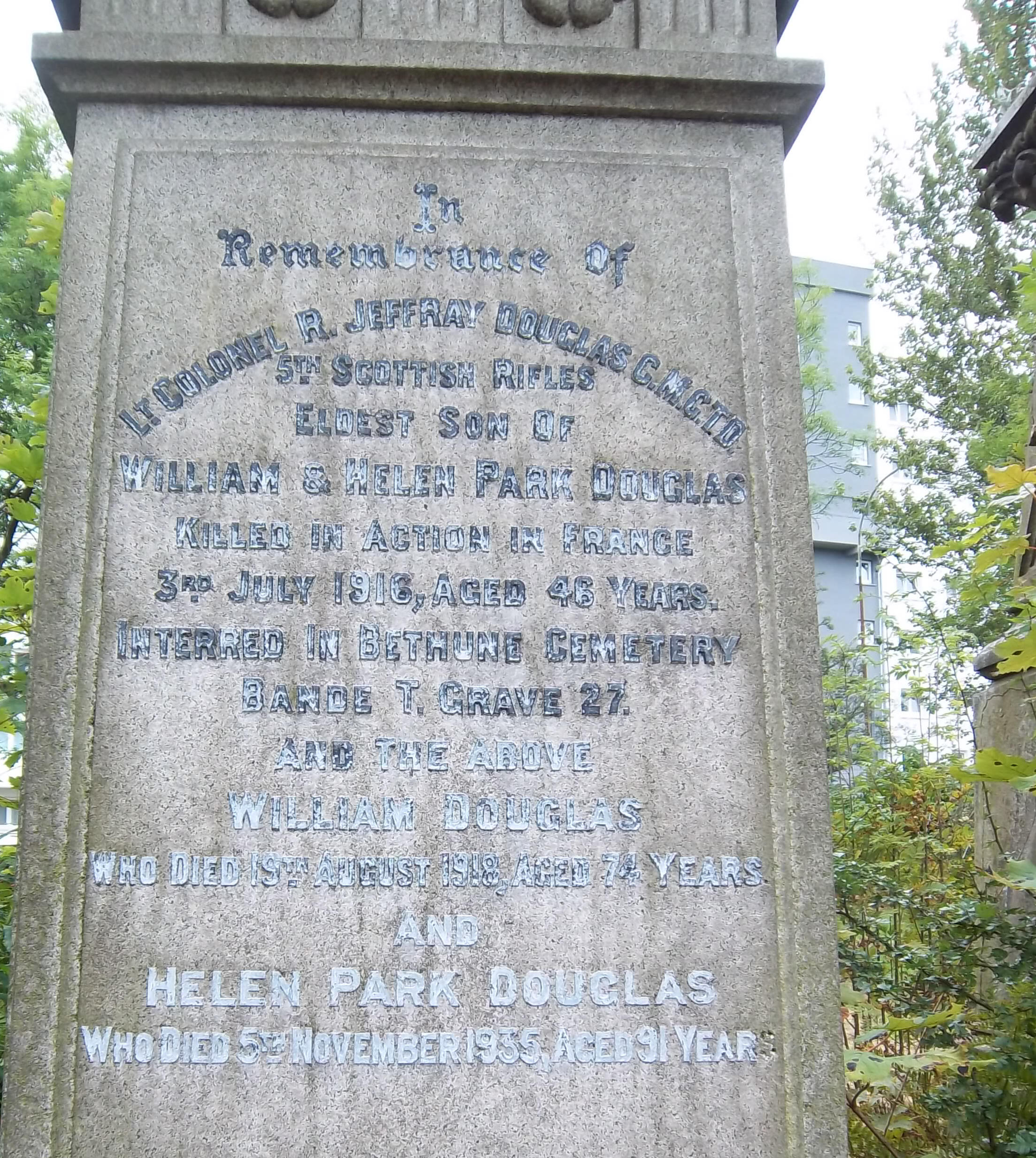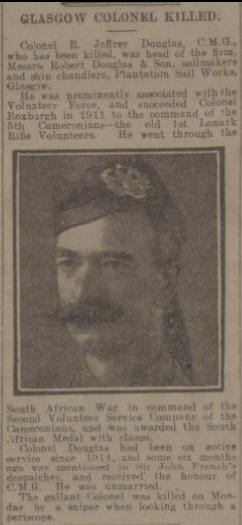 Lt Col Robert Jeffray Douglas, TD, CMG, (1869-1916) was the son of William and Helen