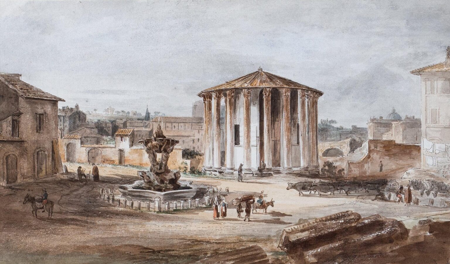 debt. An uncle, Sir James Shaw of Polmadie [1764-1843], Lord Mayor of London and an M.P. from 1809-1818, made strenuous efforts to have his uncle's Castle Douglas baronetcy transferred, without success. Although he was unmarried, he had an illegitimate son, Charles Douglas. who joined the Honourable East India Company Service, serving as a military officer. He was born in about 1810. He appears to have benefitted from a number of legacies, though whether these reached him in India is not known. Offered for sale in July 2021 by Abbott and Holder, when it was described as "Douglas M.P. F.R.S.E. (1784?-1821), William Italy; Rome, the Temple of Hercules Victor (AKA The Temple of Vesta) and the Piazza Bocca della Verità. Pen, ink and watercolour. c.1816-1818. Douglas funded and accompanied Hugh William ‘Grecian’ Williams F.R.S.E. (1773-1829) on his tour of the continent. The figure seated sketching to the left of the fountain is likely Williams. Provenance: The ‘De la Hanty Album’. Exhibited: Stephen Somerville (as Hugh William ‘Grecian’ Williams). 10×17.25 inches.
